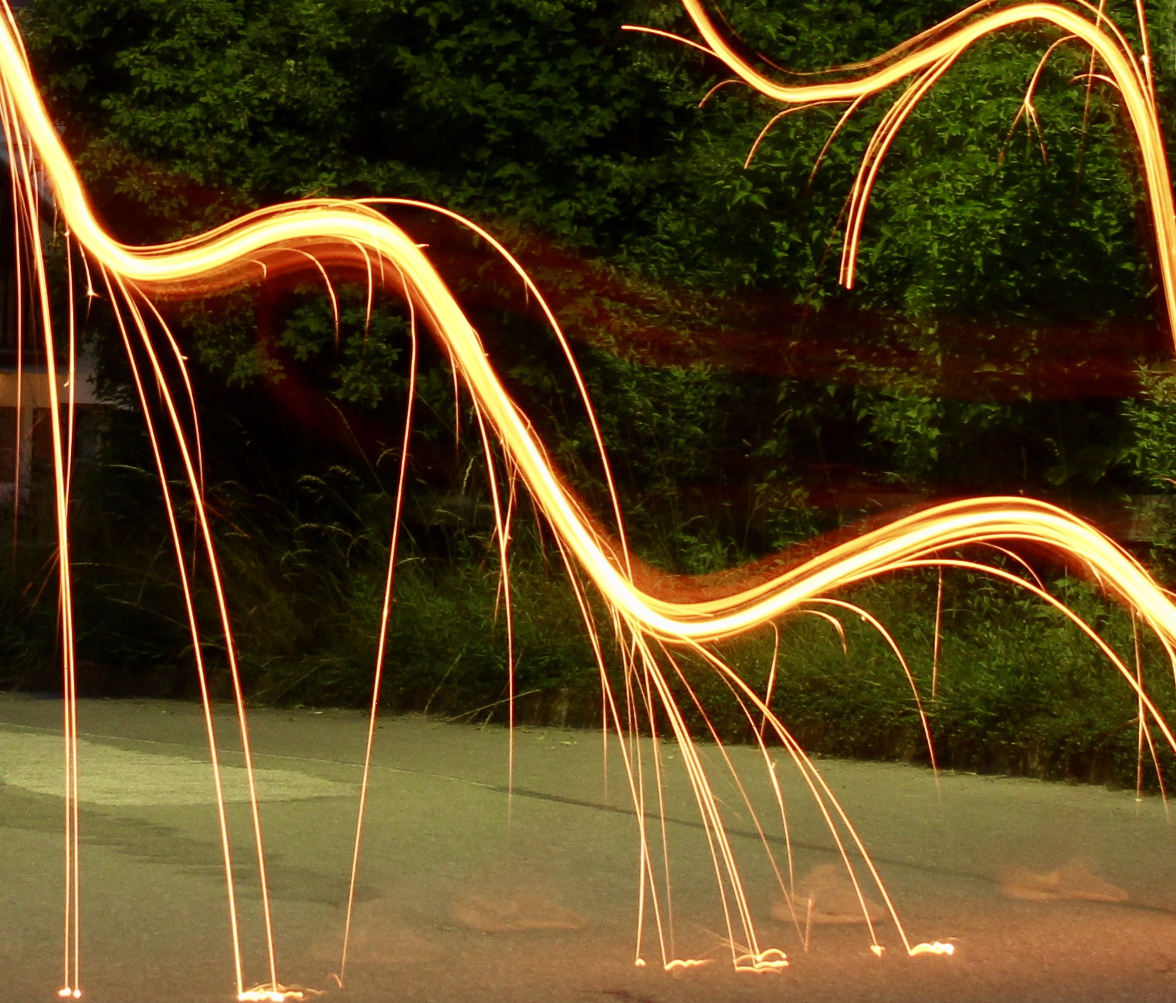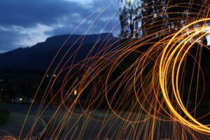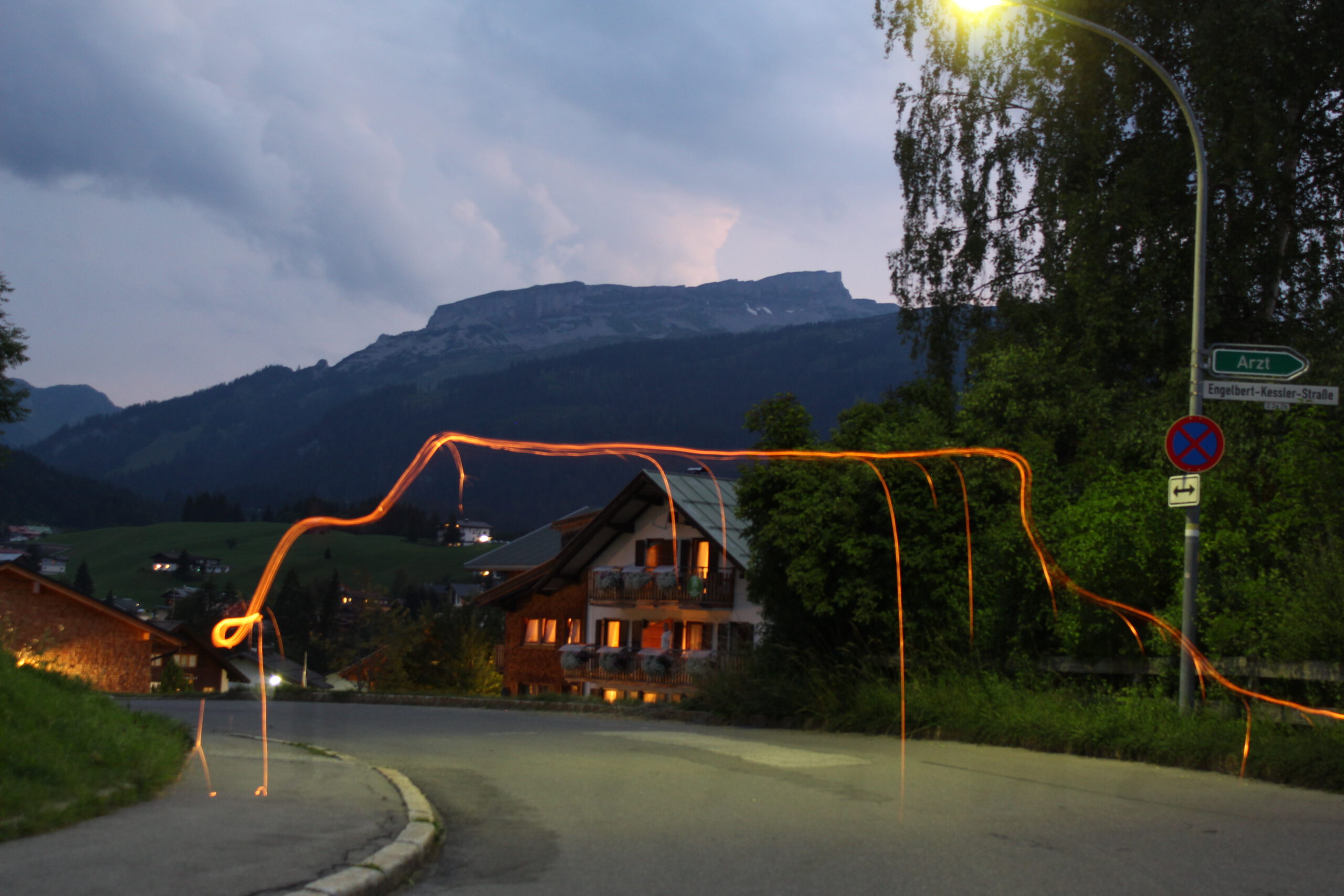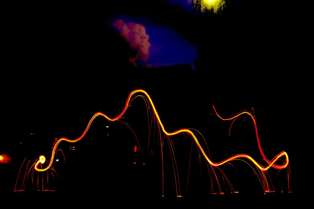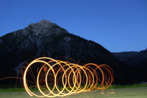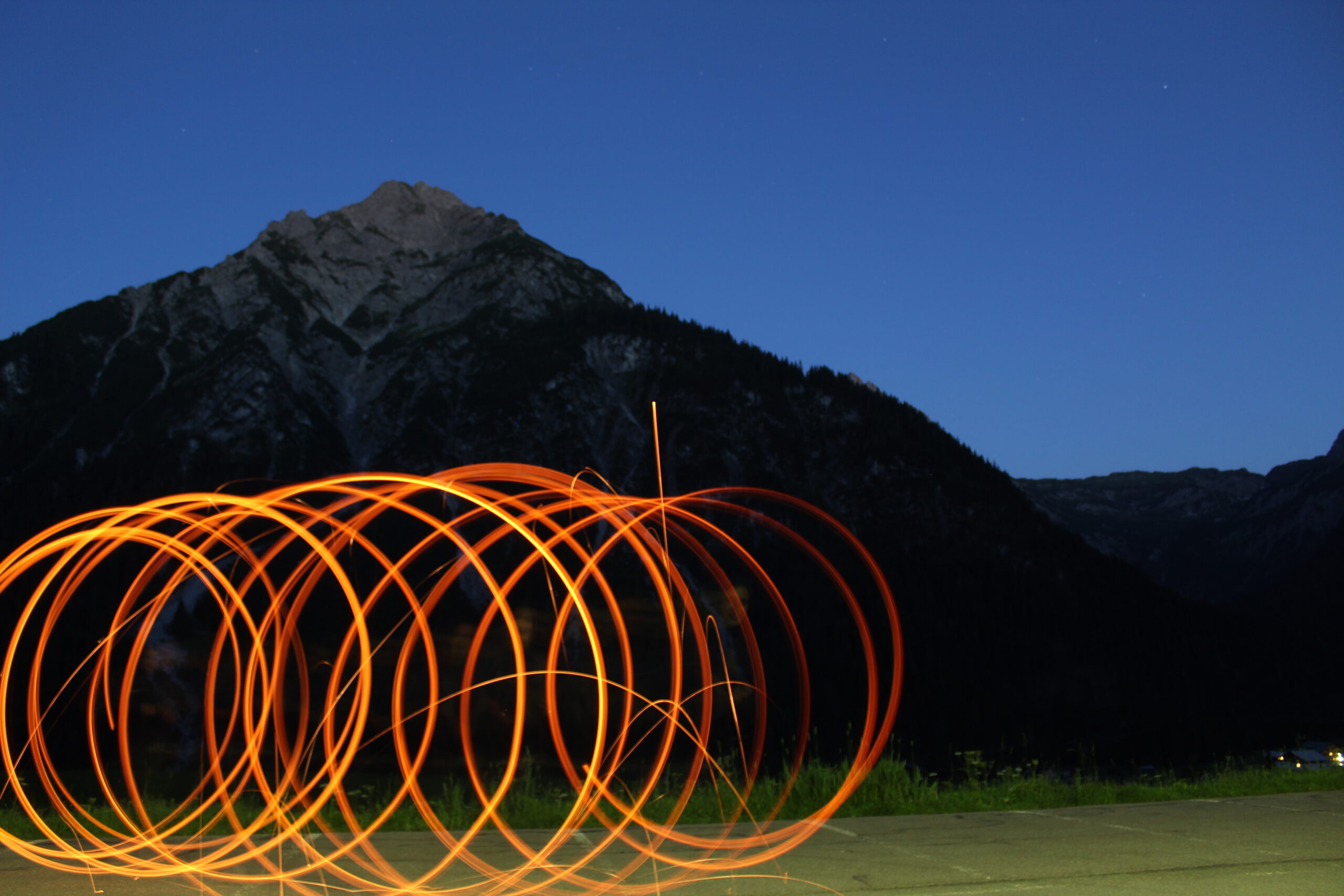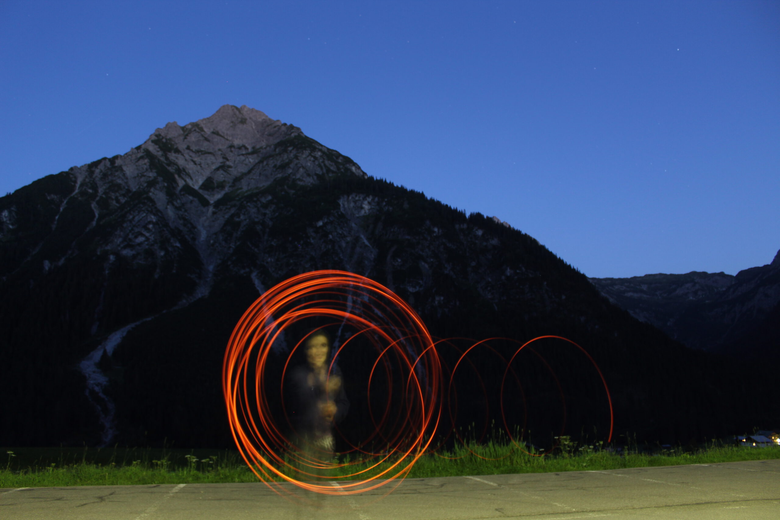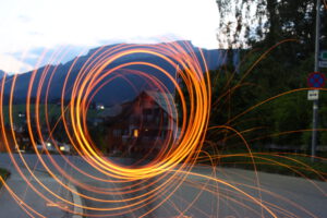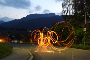 Die ersten Versuche sind nicht ganz so spektakulär geworden, doch mit der Zeit wurden die Bilder immer besser. Ich habe verschiedene Taschenlampen mit verschiedenen LED-Stärken ausprobiert, bevor ich erste Versuche mit Feuer wagte. Der Umgang mit dem Feuer war etwas schwierig, da man aufpassen musste, dass keine Funken ins Gras flogen.