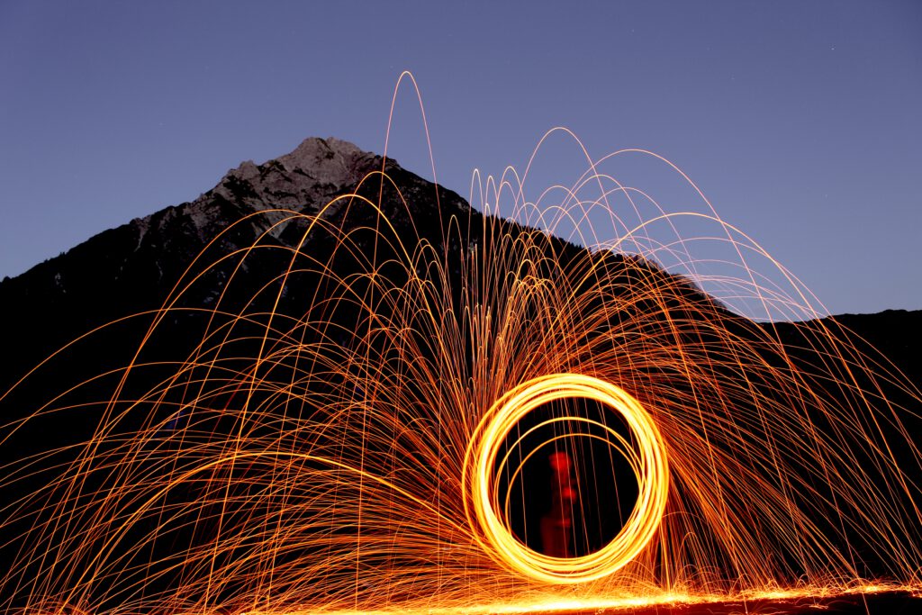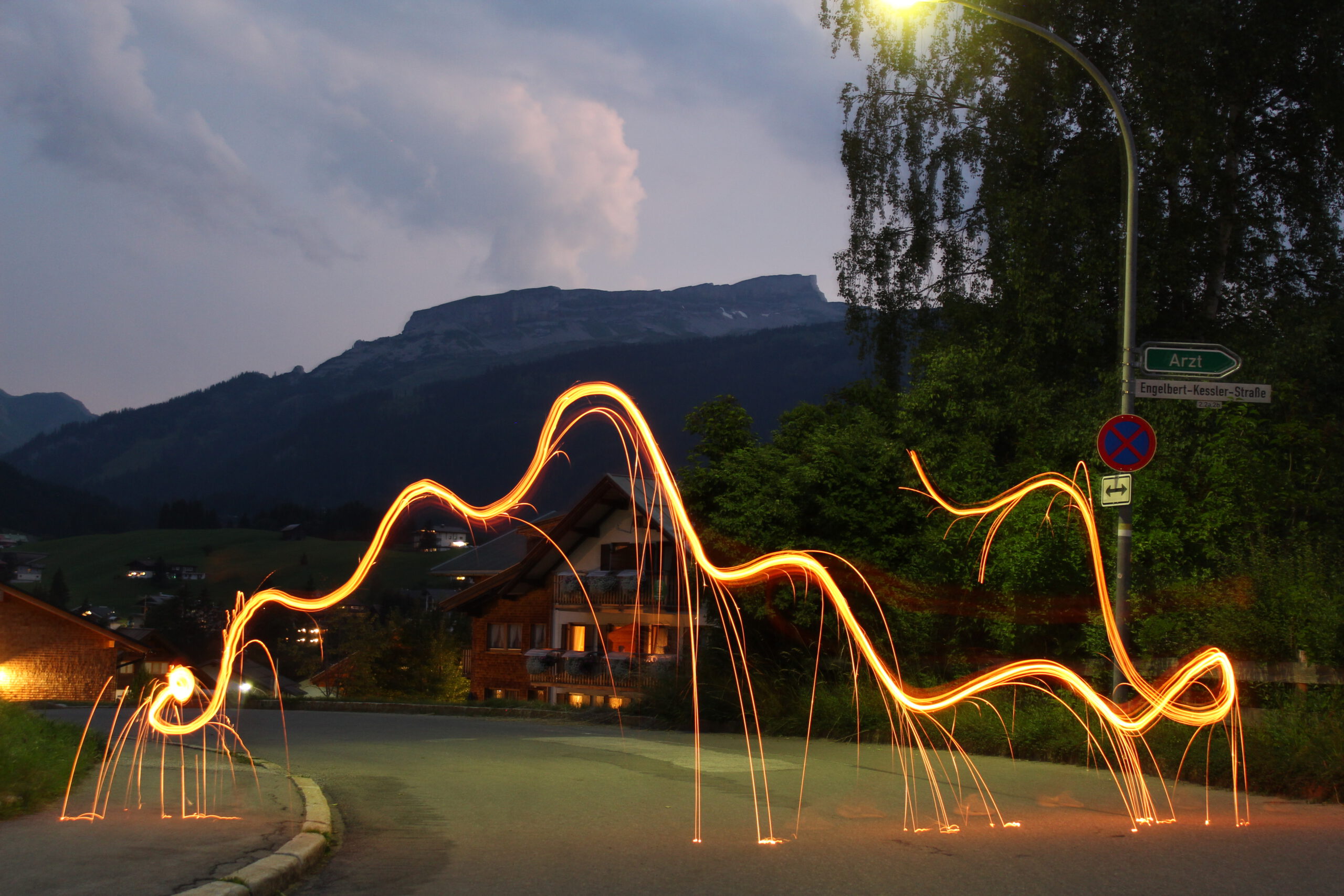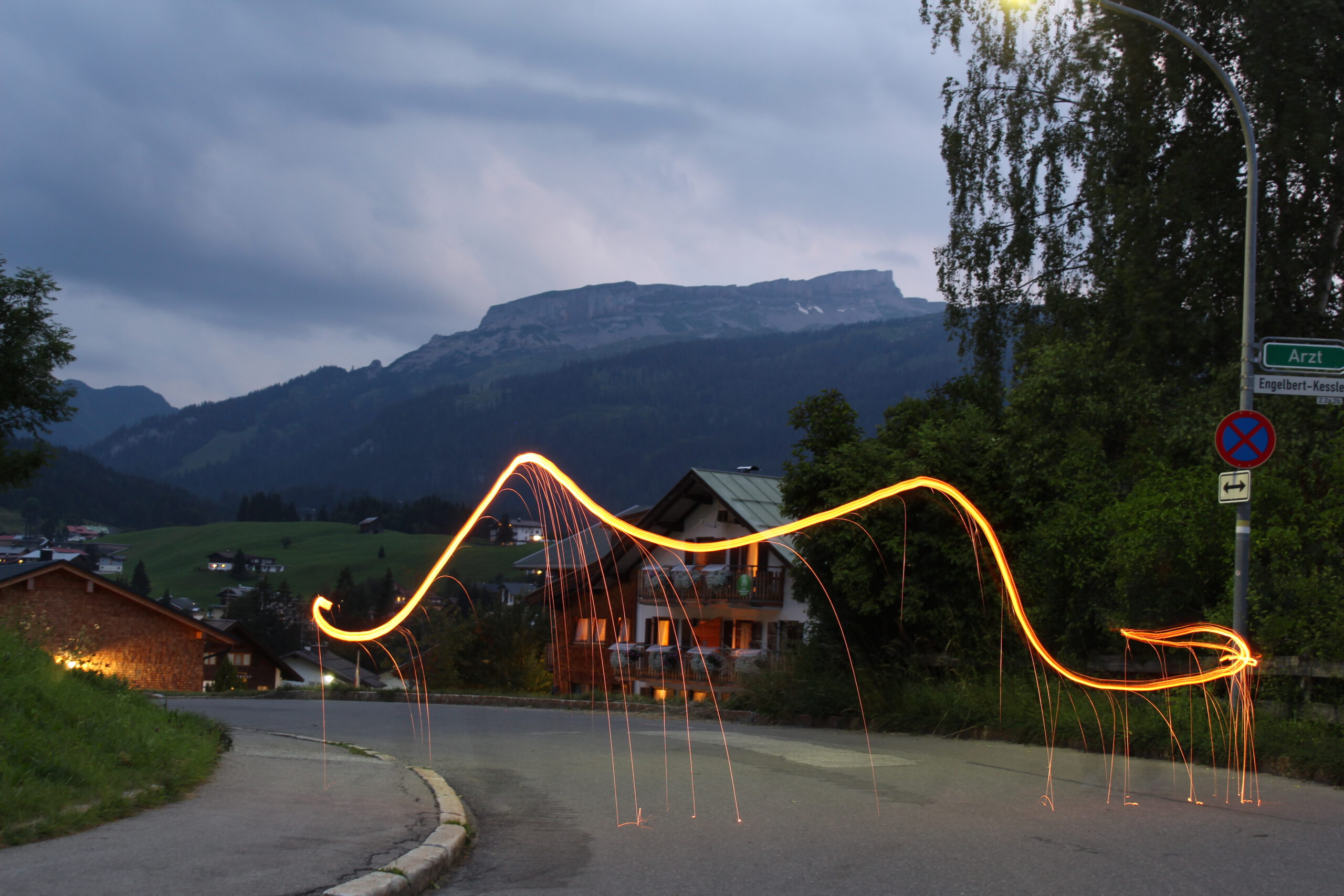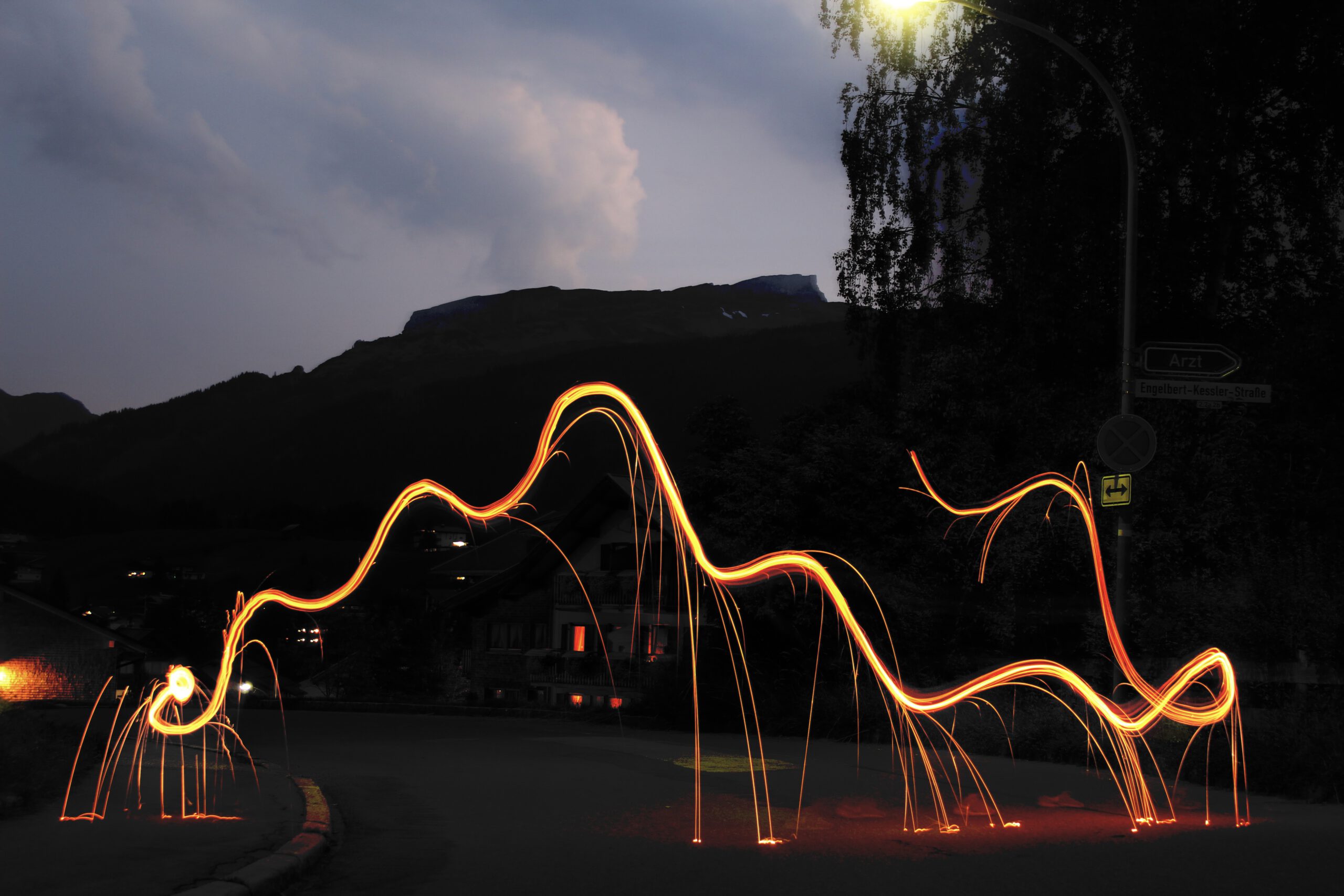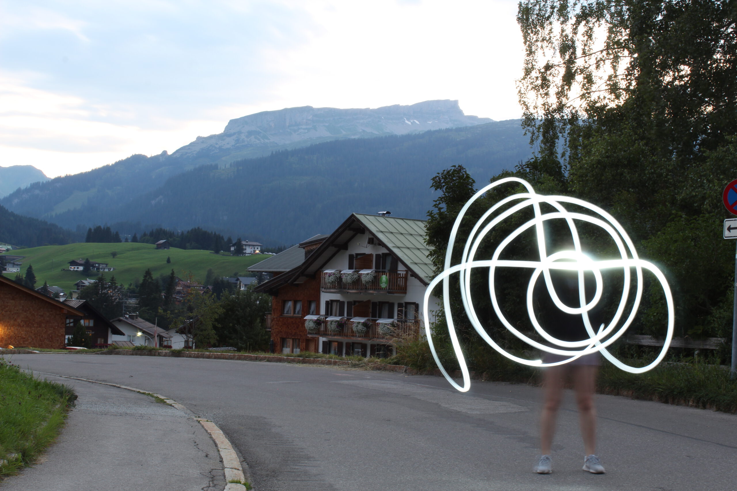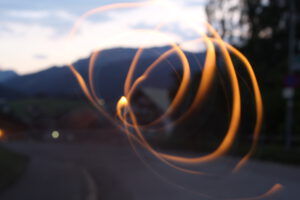 Die ersten Versuche sind nicht ganz so spektakulär geworden, doch mit der Zeit wurden die Bilder immer besser. Ich habe verschiedene Taschenlampen mit verschiedenen LED-Stärken ausprobiert, bevor ich erste Versuche mit Feuer wagte. Der Umgang mit dem Feuer war etwas schwierig, da man aufpassen musste, dass keine Funken ins Gras flogen.