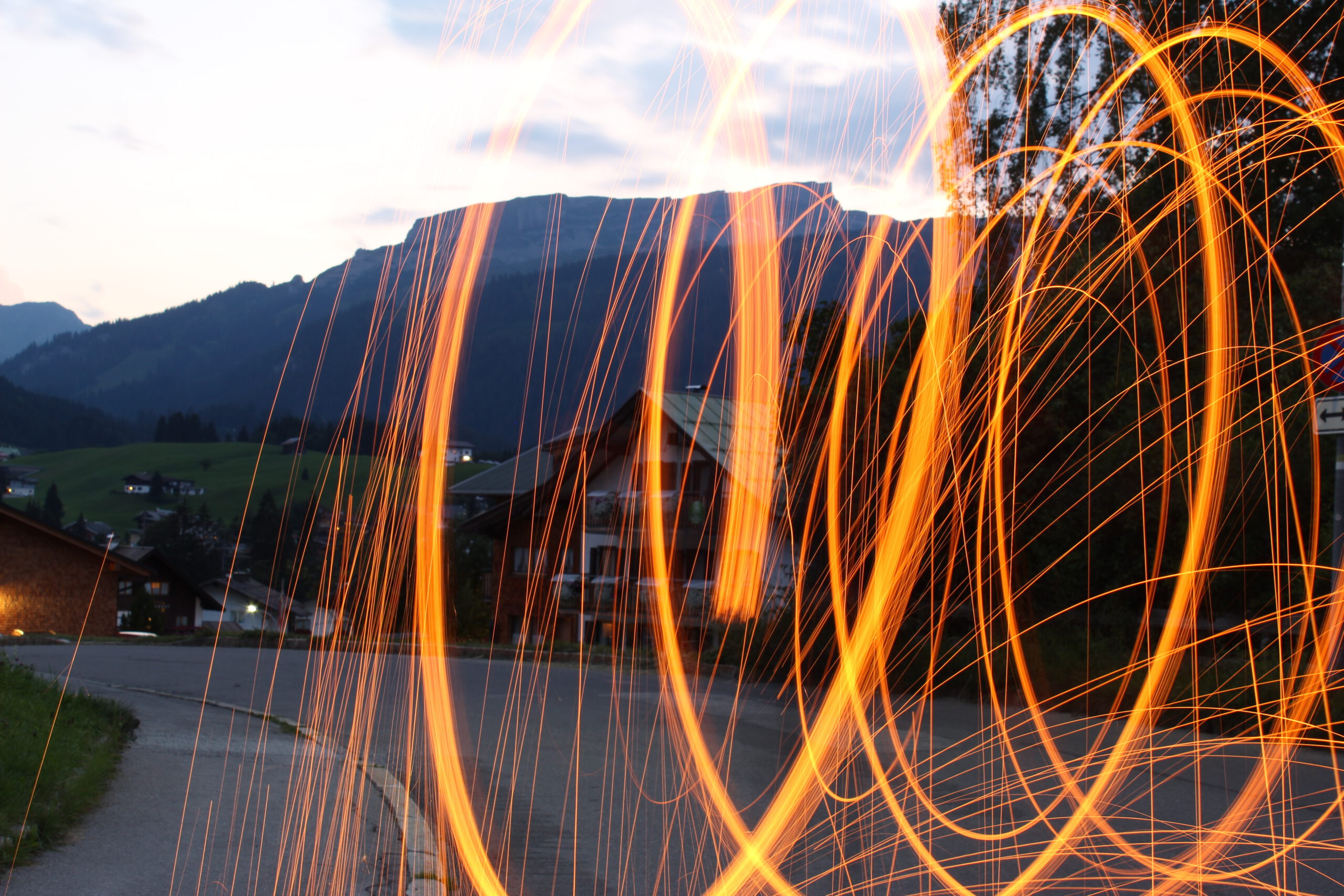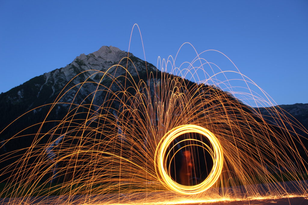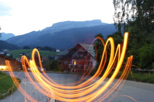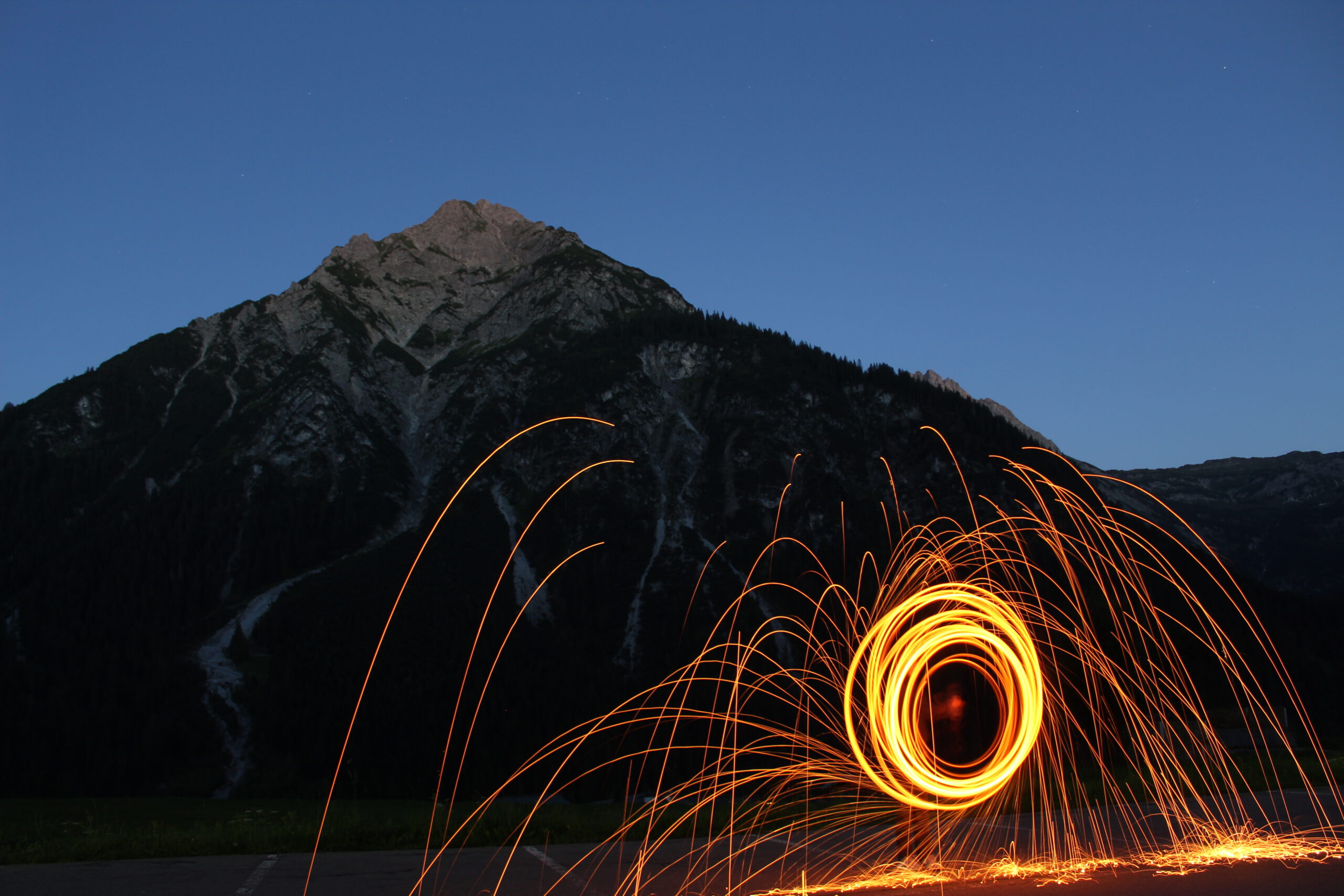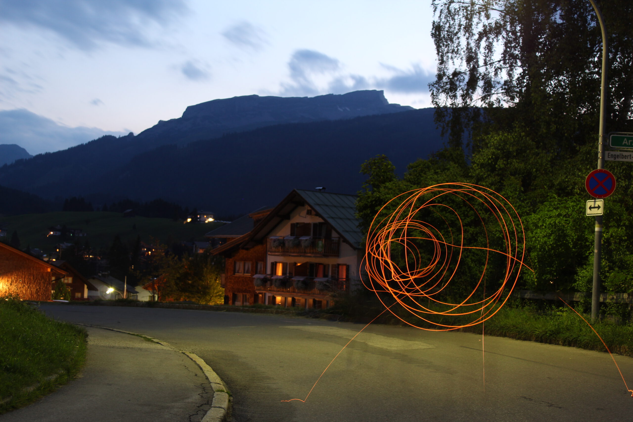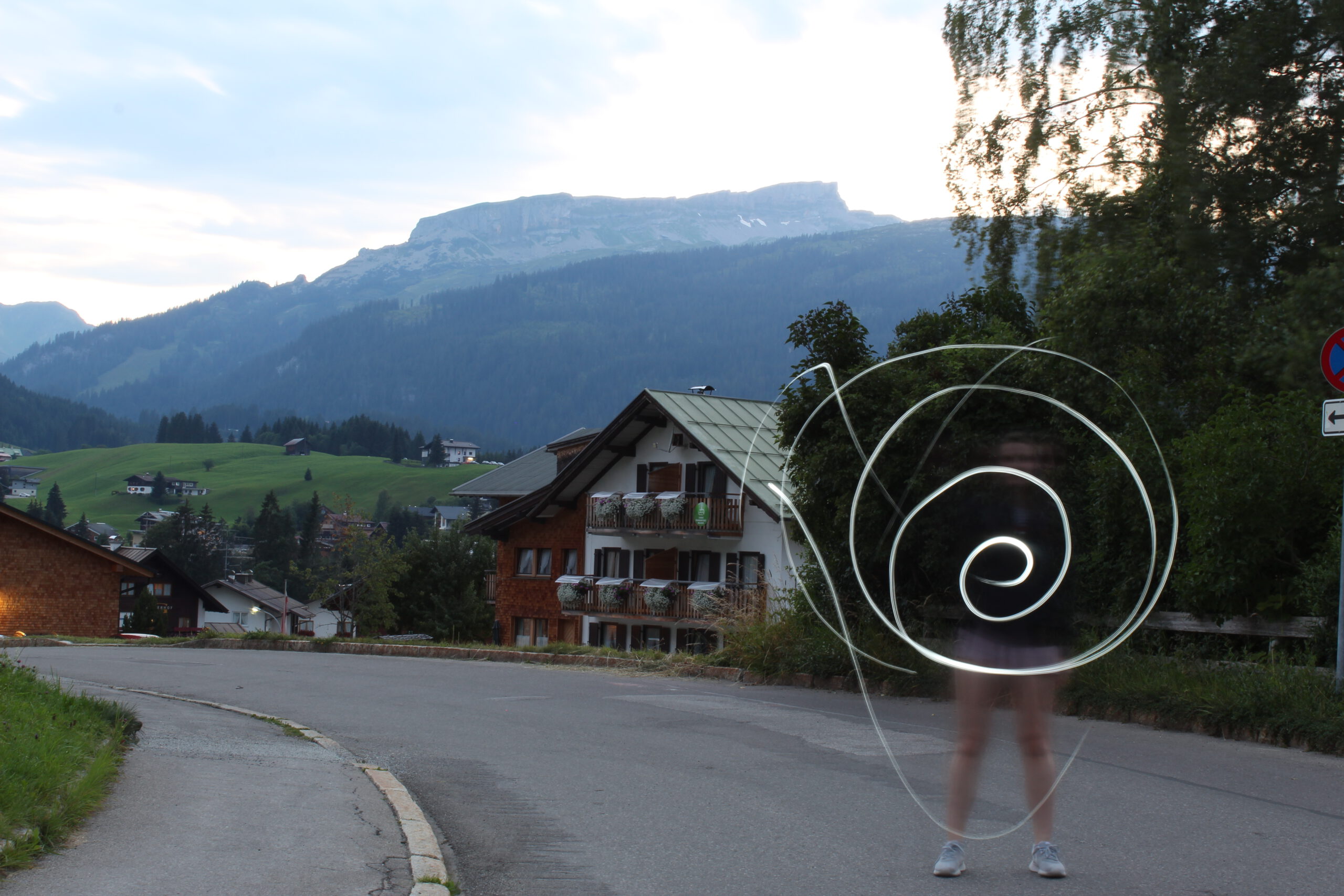 Die ersten Versuche sind nicht ganz so spektakulär geworden, doch mit der Zeit wurden die Bilder immer besser. Ich habe verschiedene Taschenlampen mit verschiedenen LED-Stärken ausprobiert, bevor ich erste Versuche mit Feuer wagte. Der Umgang mit dem Feuer war etwas schwierig, da man aufpassen musste, dass keine Funken ins Gras flogen.