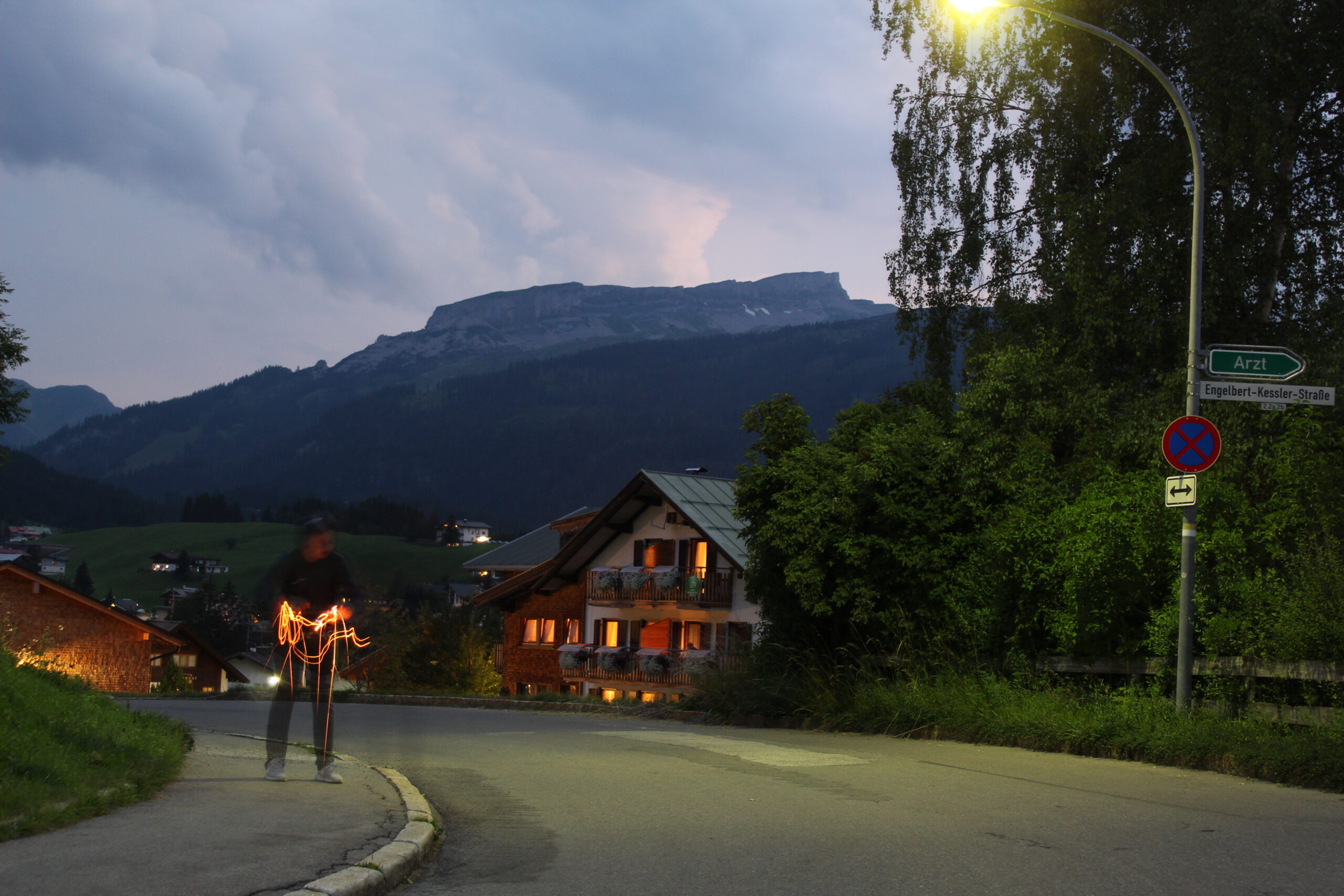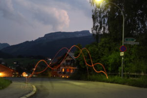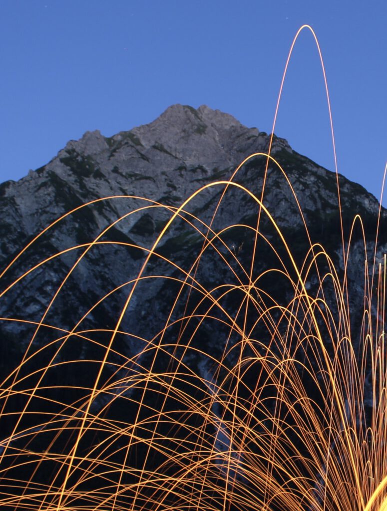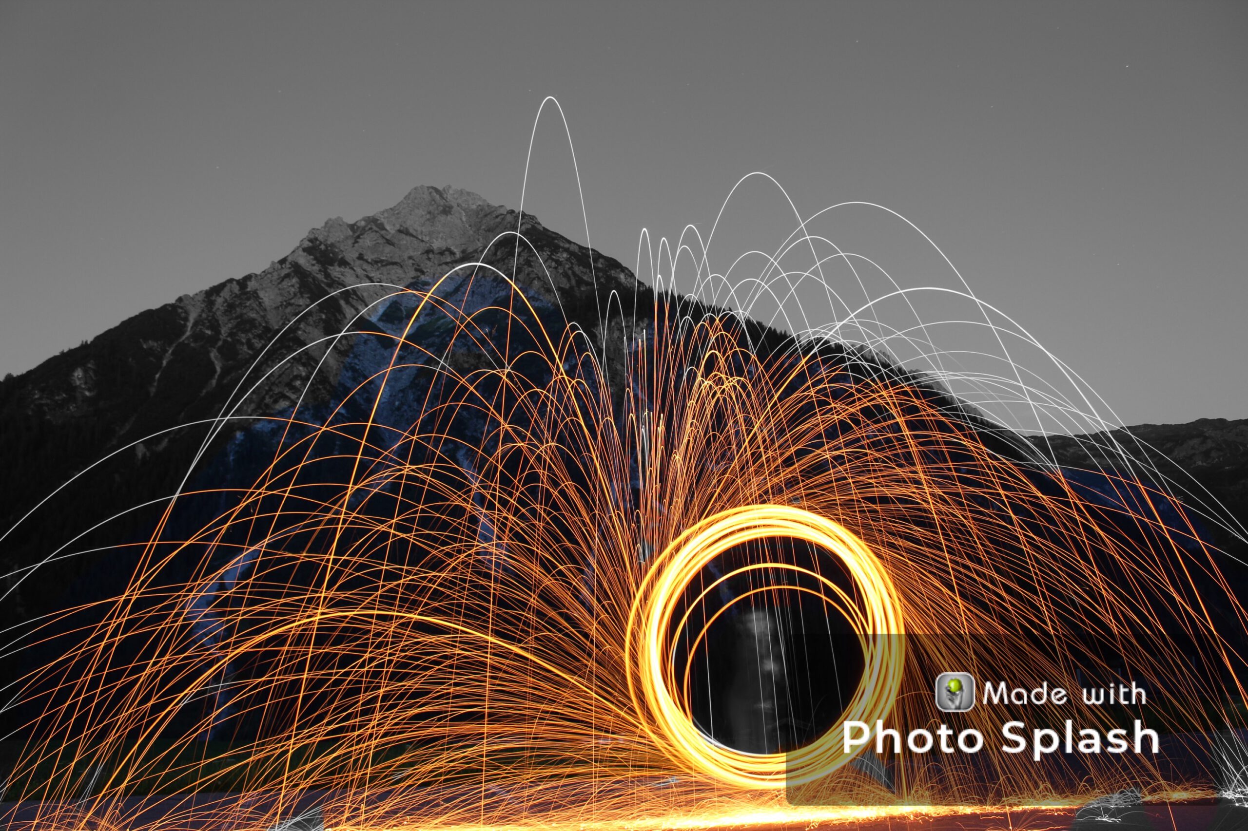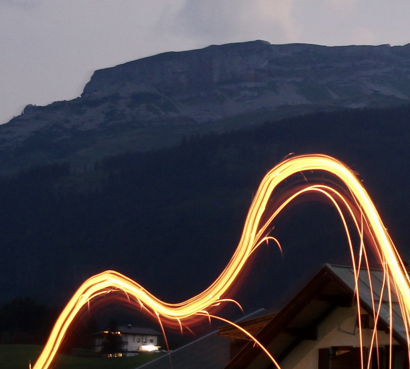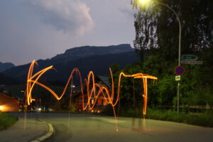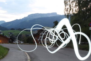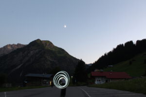 Die ersten Versuche sind nicht ganz so spektakulär geworden, doch mit der Zeit wurden die Bilder immer besser. Ich habe verschiedene Taschenlampen mit verschiedenen LED-Stärken ausprobiert, bevor ich erste Versuche mit Feuer wagte. Der Umgang mit dem Feuer war etwas schwierig, da man aufpassen musste, dass keine Funken ins Gras flogen.