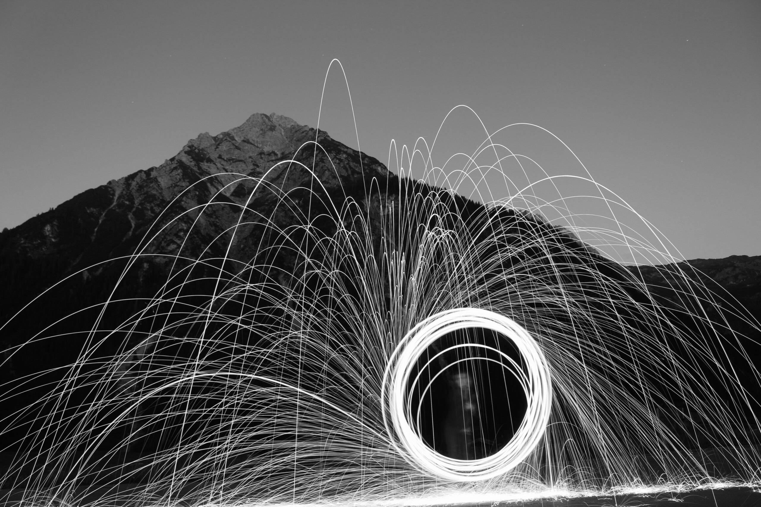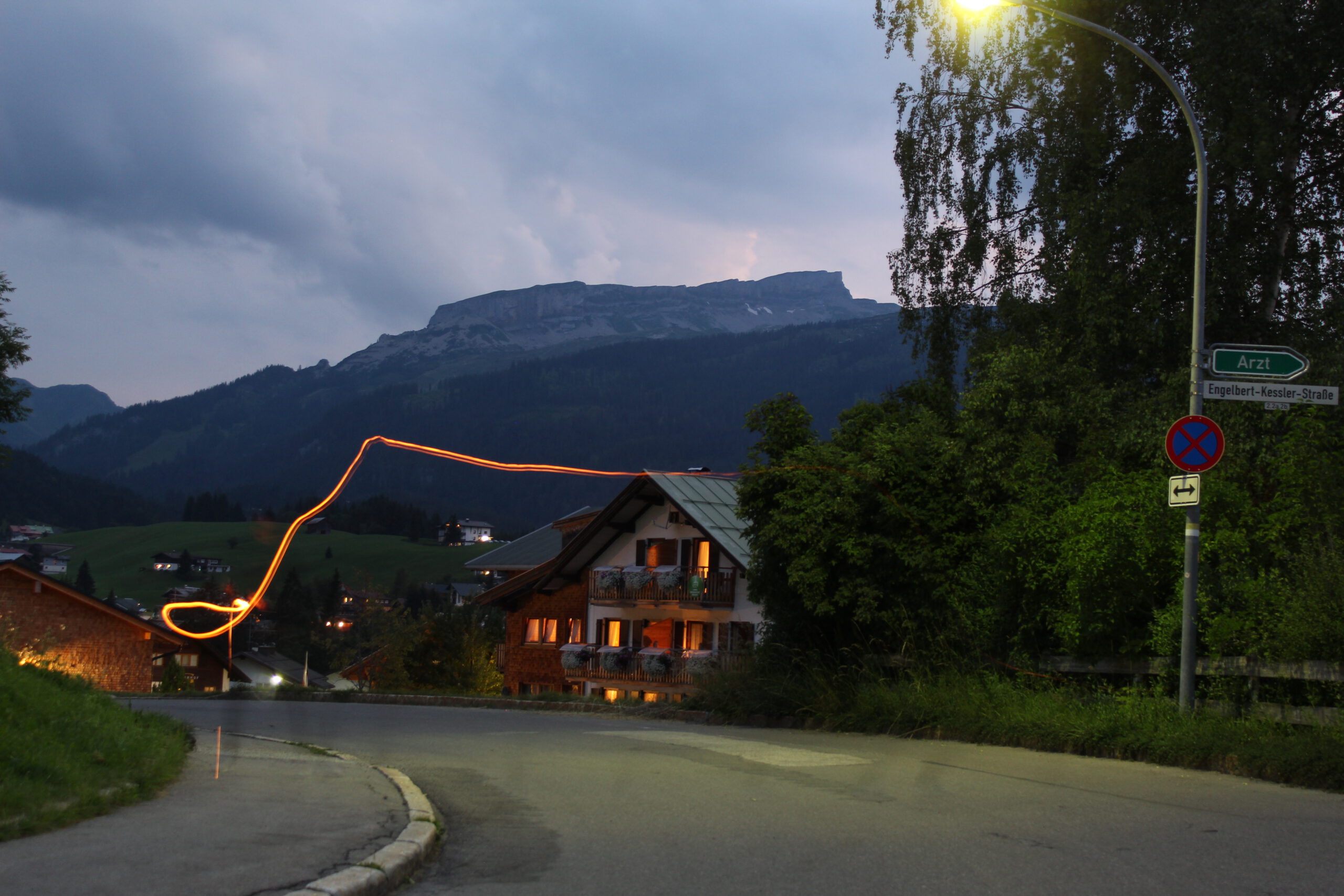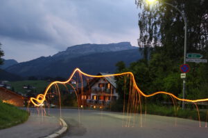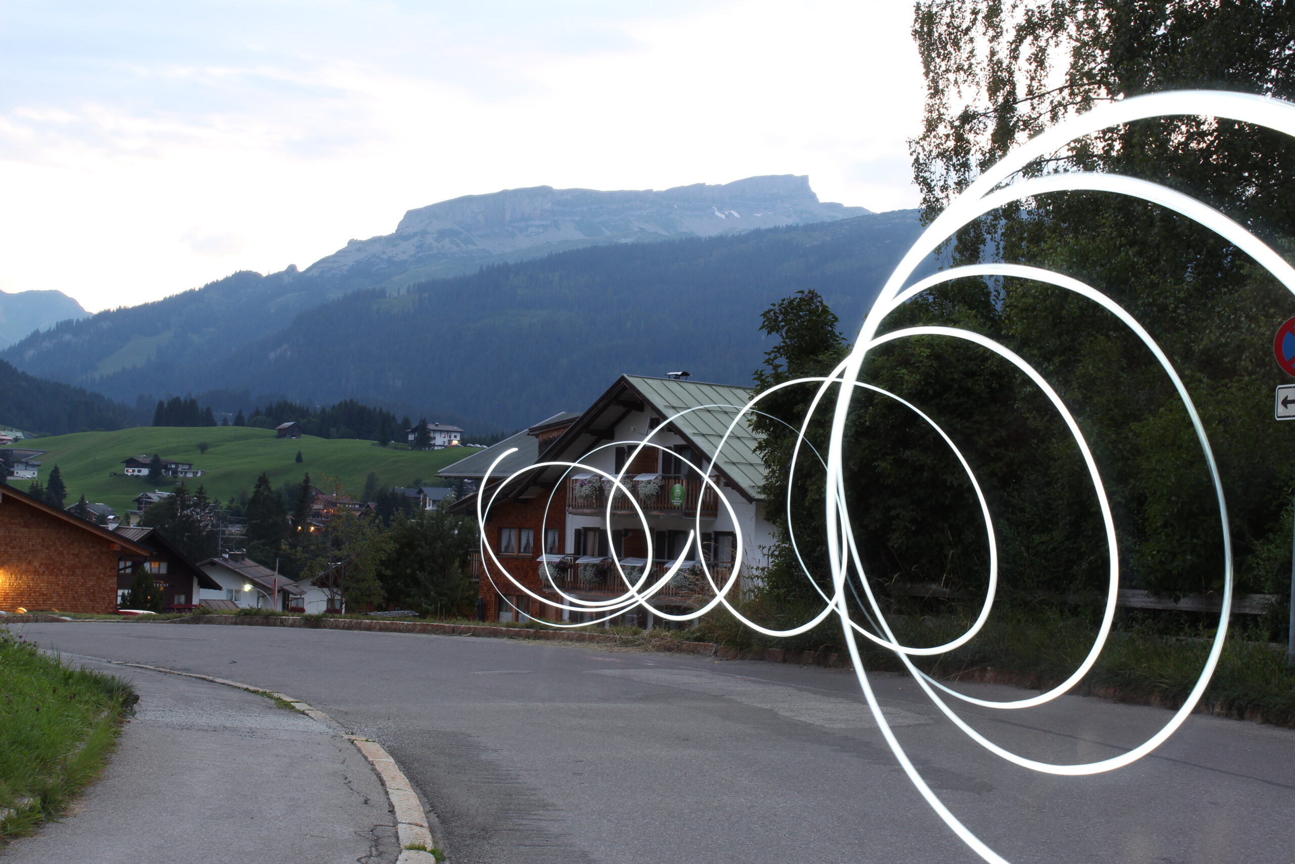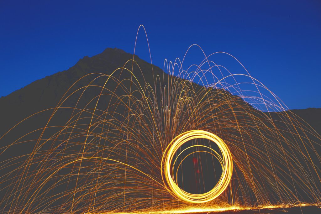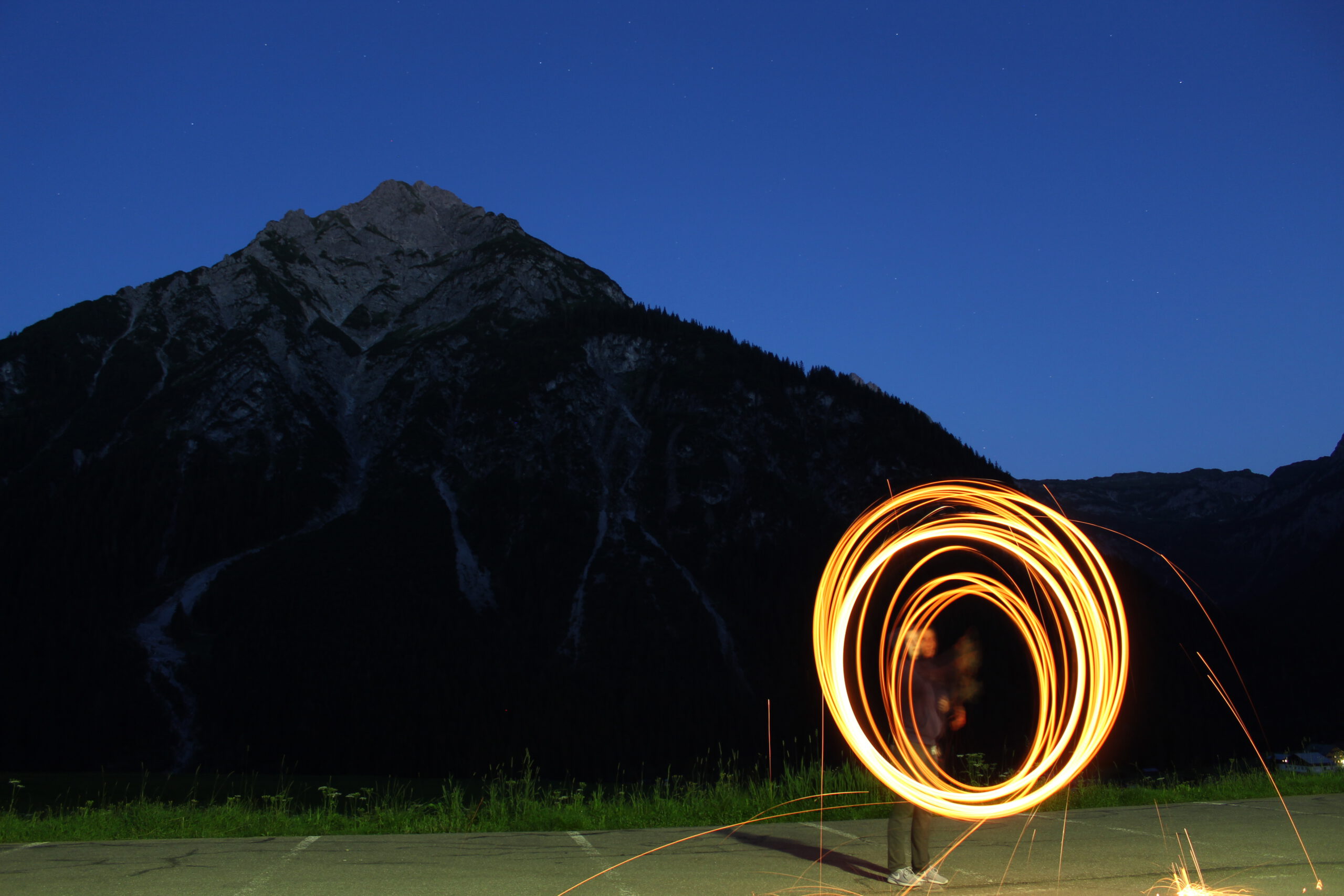 Die ersten Versuche sind nicht ganz so spektakulär geworden, doch mit der Zeit wurden die Bilder immer besser. Ich habe verschiedene Taschenlampen mit verschiedenen LED-Stärken ausprobiert, bevor ich erste Versuche mit Feuer wagte. Der Umgang mit dem Feuer war etwas schwierig, da man aufpassen musste, dass keine Funken ins Gras flogen.