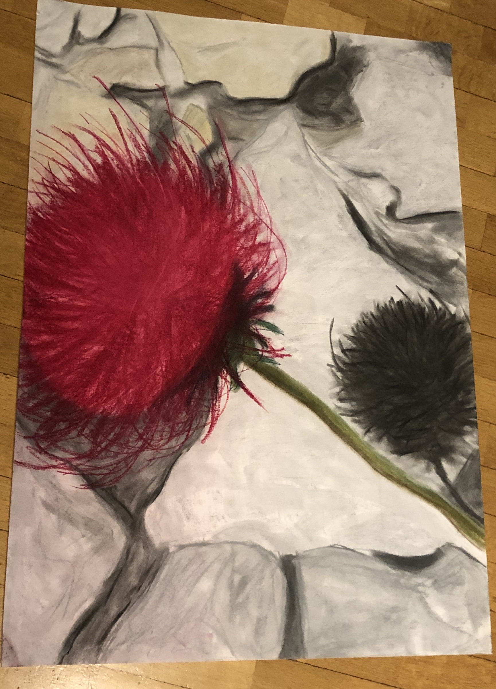 Ich hatte direkt große Freude daran, mit Pastellkreide zu arbeiten und habe so ein neues Medium gefunden, mit dem ich sehr gerne wieder arbeiten möchte. Der Kurs hat mir sehr geholfen loszulassen und nicht immer auf Kleinigkeiten beim Malen zu achten. Früher habe ich mich oft an so etwas aufgehalten und stundenlang überlegt, wie ich am besten weitermache, damit es perfekt wird. Durch den „Zeitdruck“ hatte man gar keine Zeit darüber nachzudenken. Auch das große Format hat meine Arbeitsweise „lockerer“ gemacht, da man auf so einem Format freier und größer malen kann. Insgesamt hatte ich sehr viel Spaß in diesem Seminar und ich hatte Glück, dass ich es direkt im ersten Semester belegt habe, da ich so eine große Vorfreude auf das Kunststudium entwickelt habe.